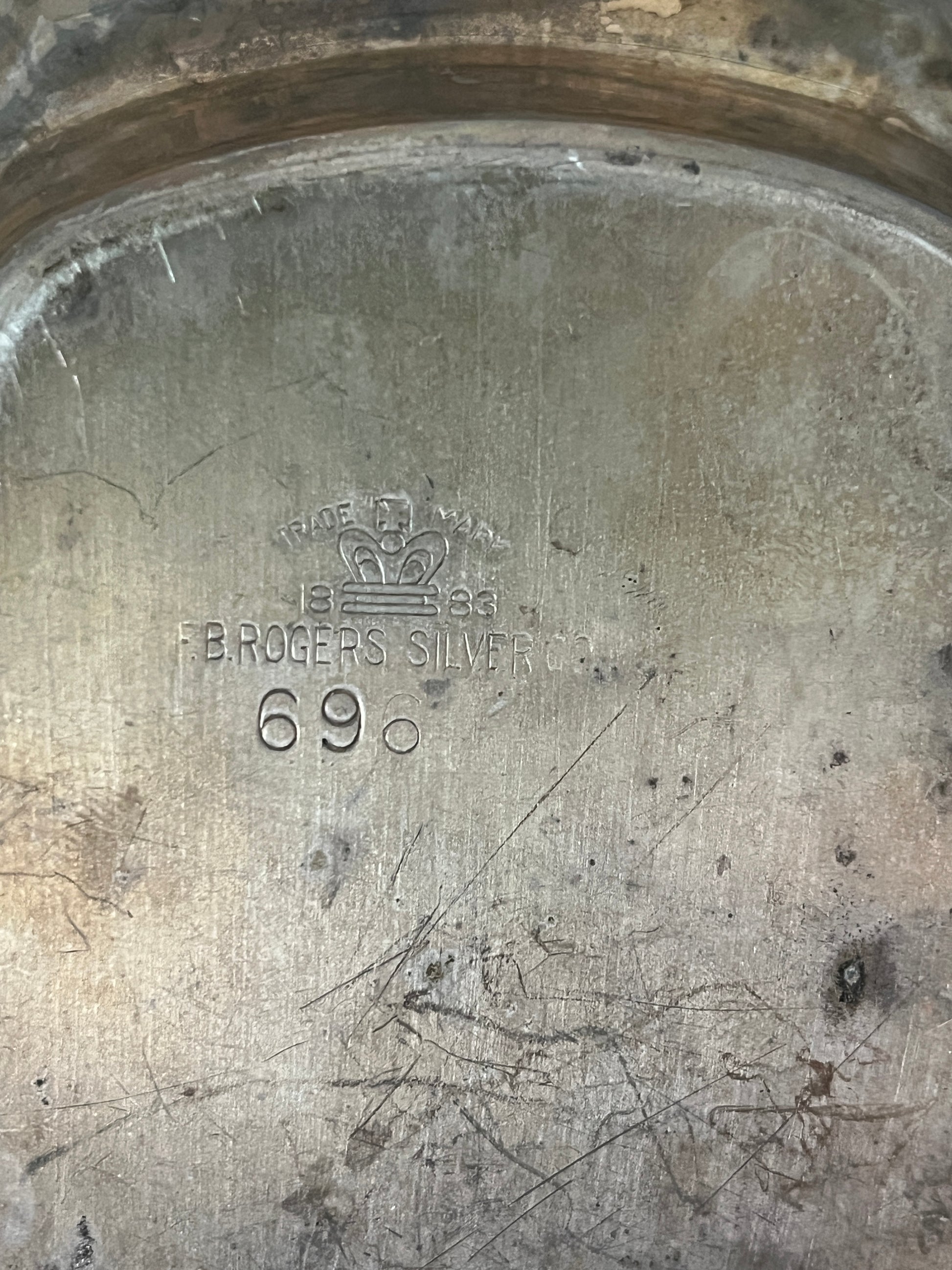 696 stamped F.B. Rogers Silver Co. butter dish with glass insert. It has an aged patina to pair perfect with your next haunted dinner party or can be shined up to be stunning tableware.