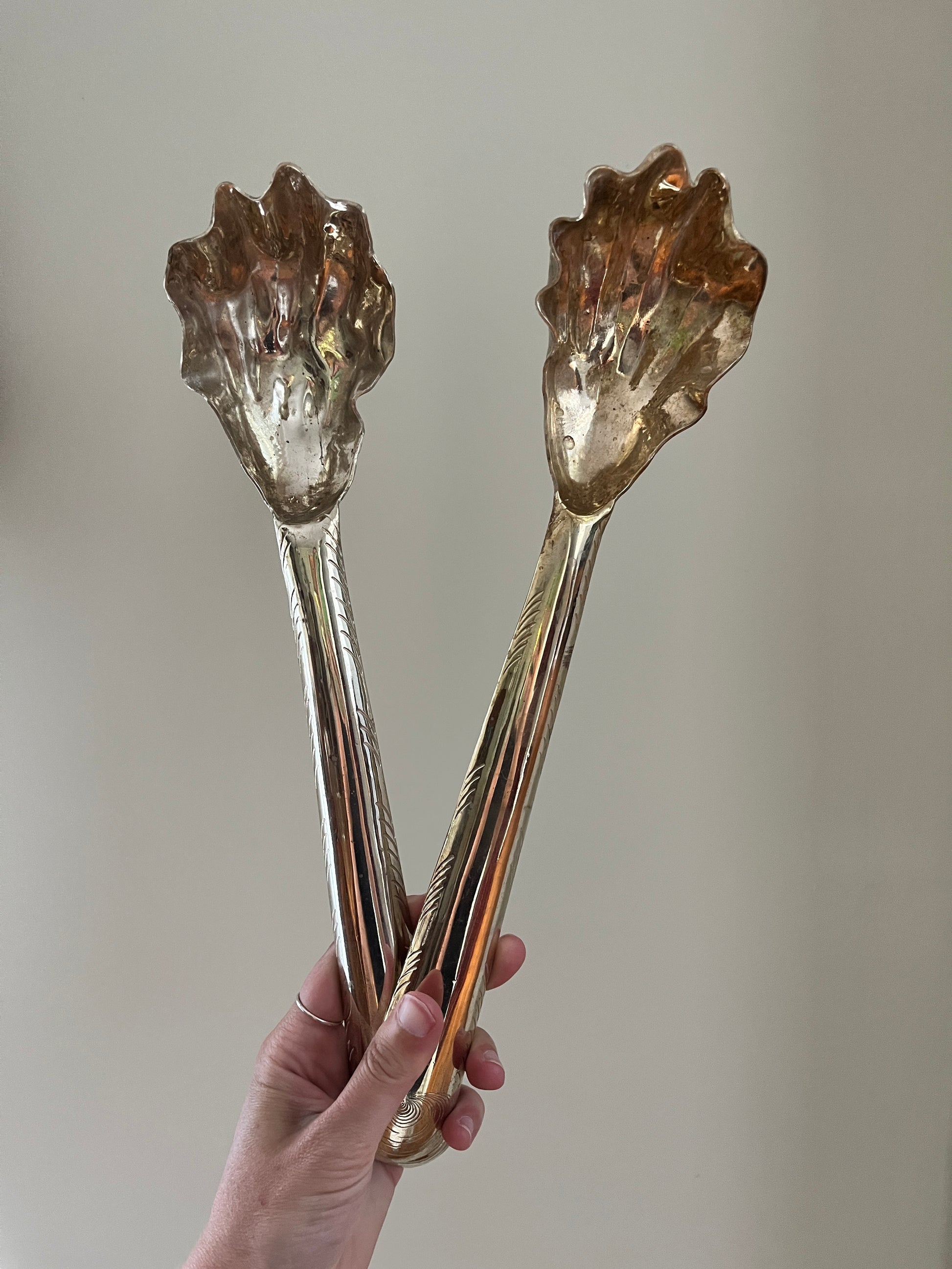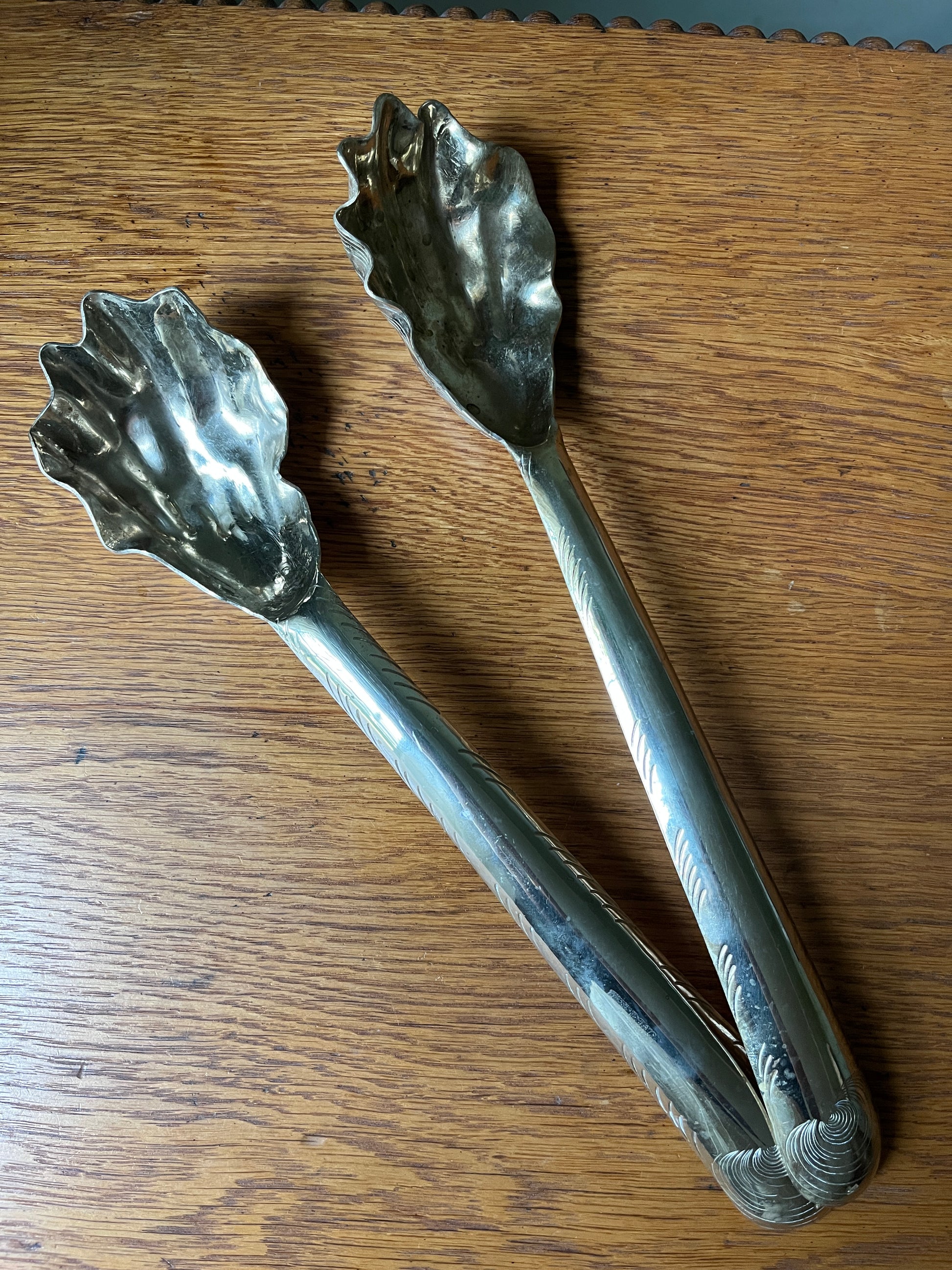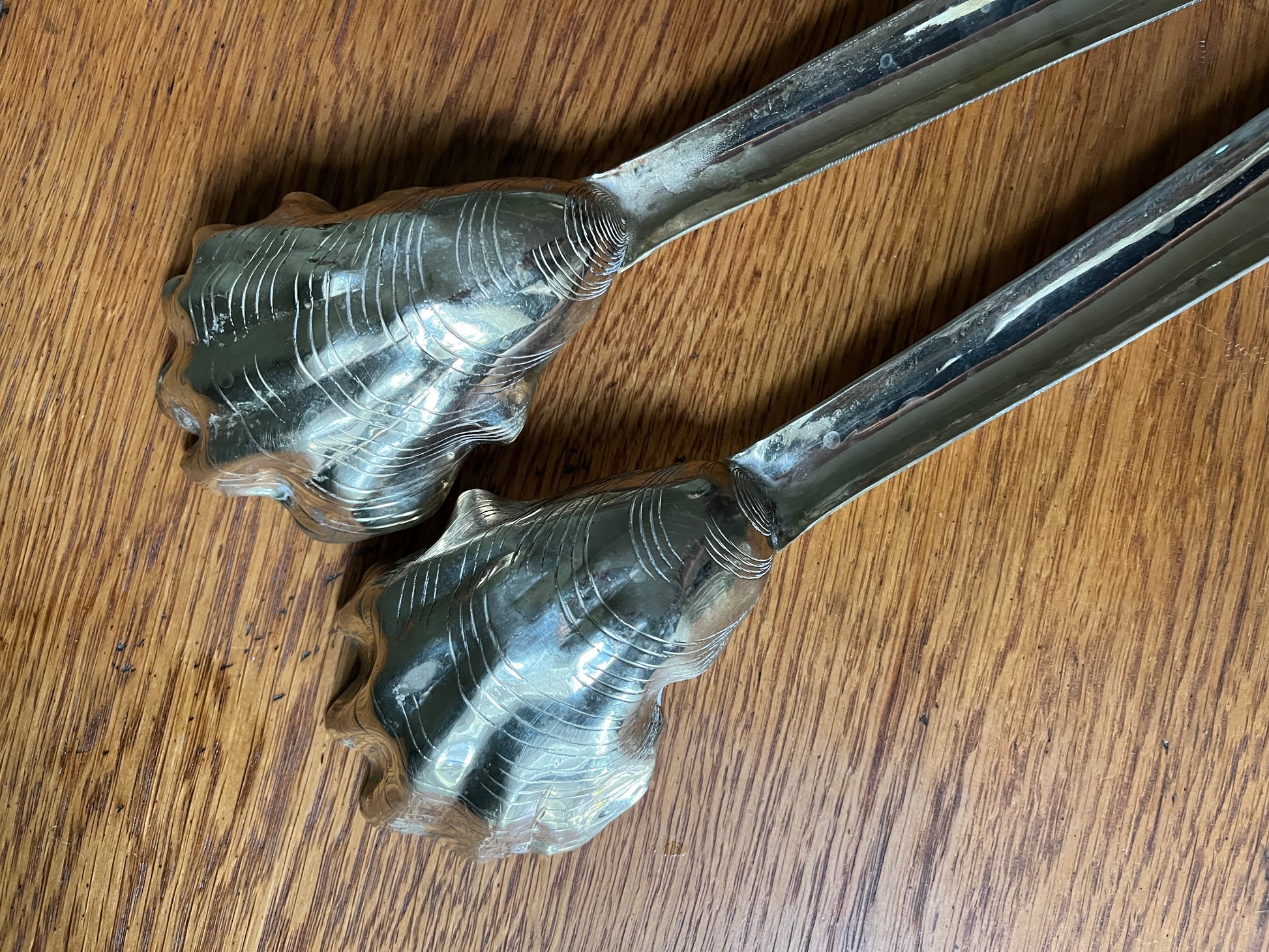 Oyster shell serving utensils hand forged in a Mexican silver alloy, known as Alpaca. These are not only aesthetically elegant as servers, the idea that these shells were used thousands of years ago for the same utilitarian purpose by the indigenous Timiquans. The "Gogo" stamp can be seen on the back end of the utensils.