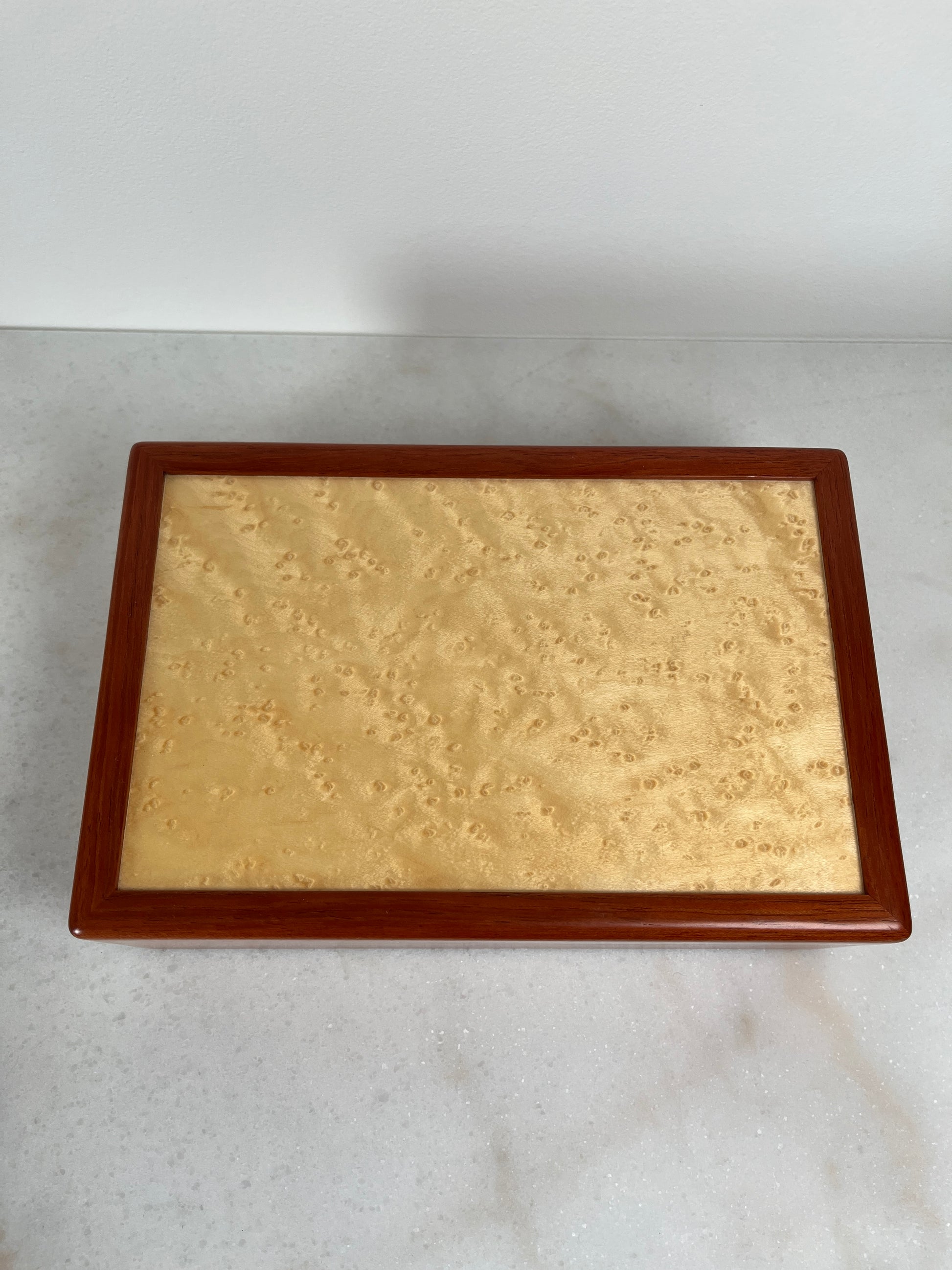 Handcrafted Bubinga & Birdseye Maple Jewelry Box | Sapphire Lined | Artisan Signed