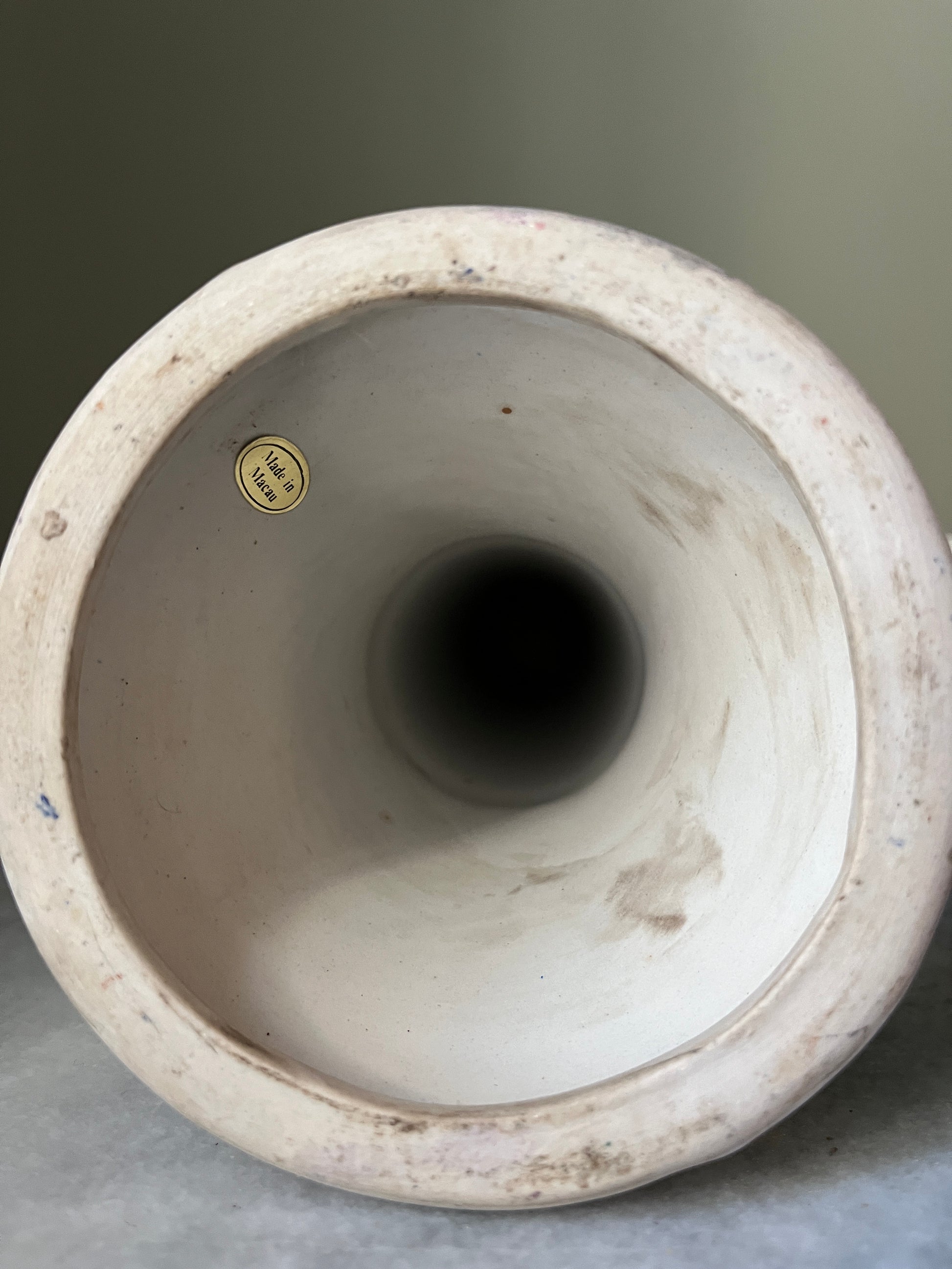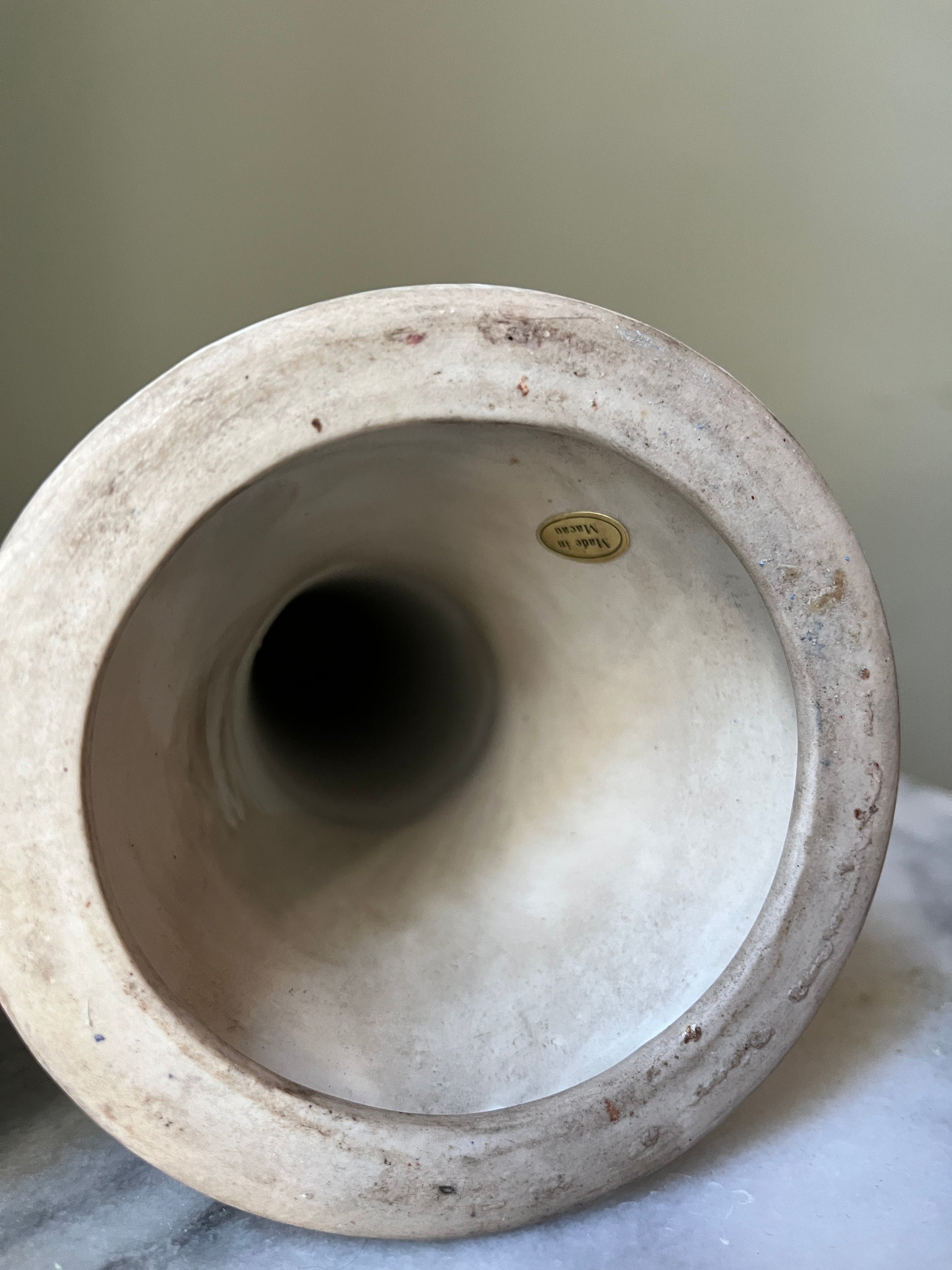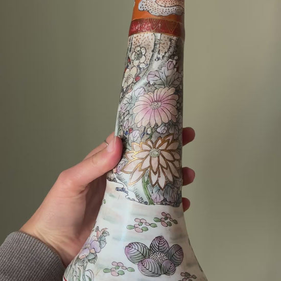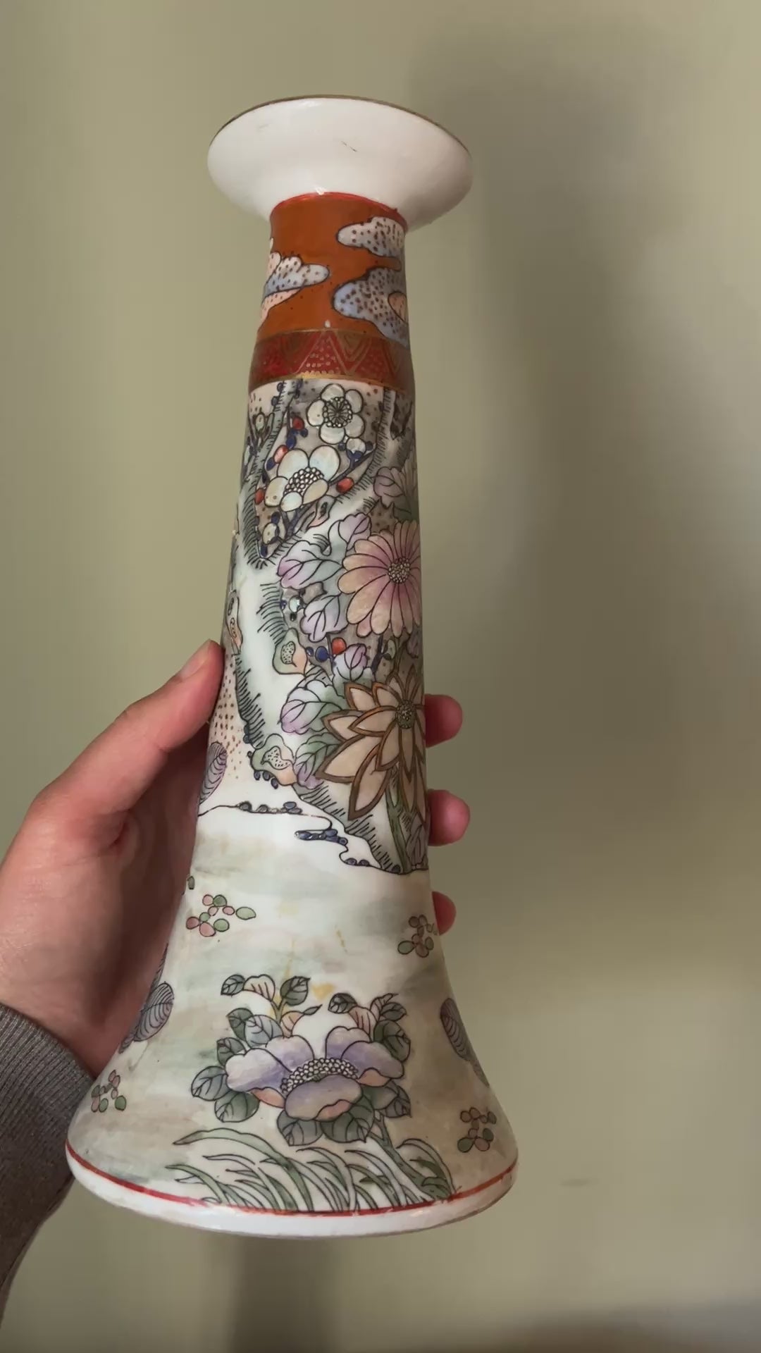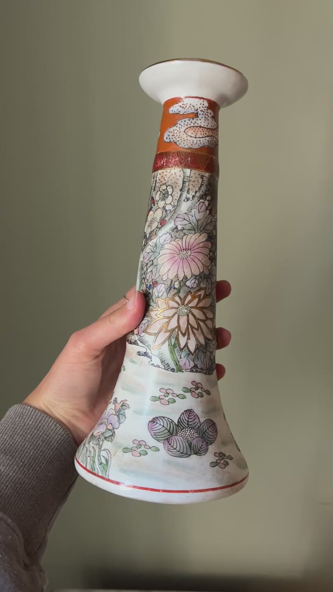 2 varying height porcelain candlesticks with ornate detailed nature scenes. There is a “Made in Macua” sticker on each.