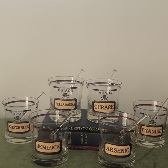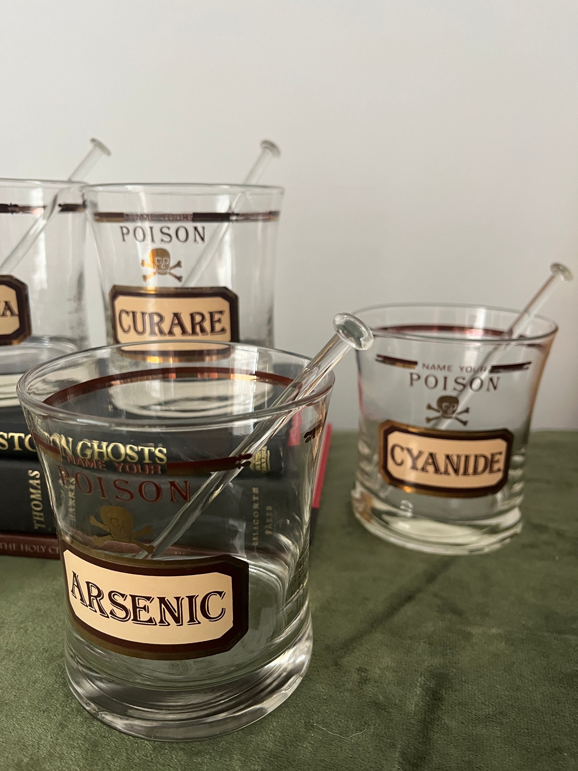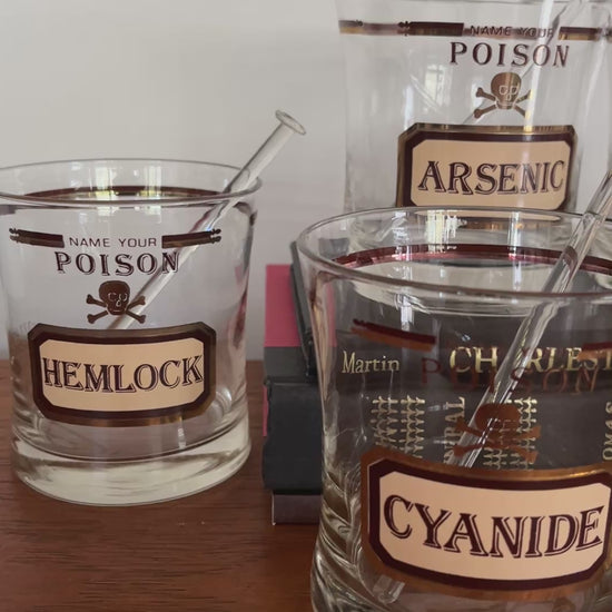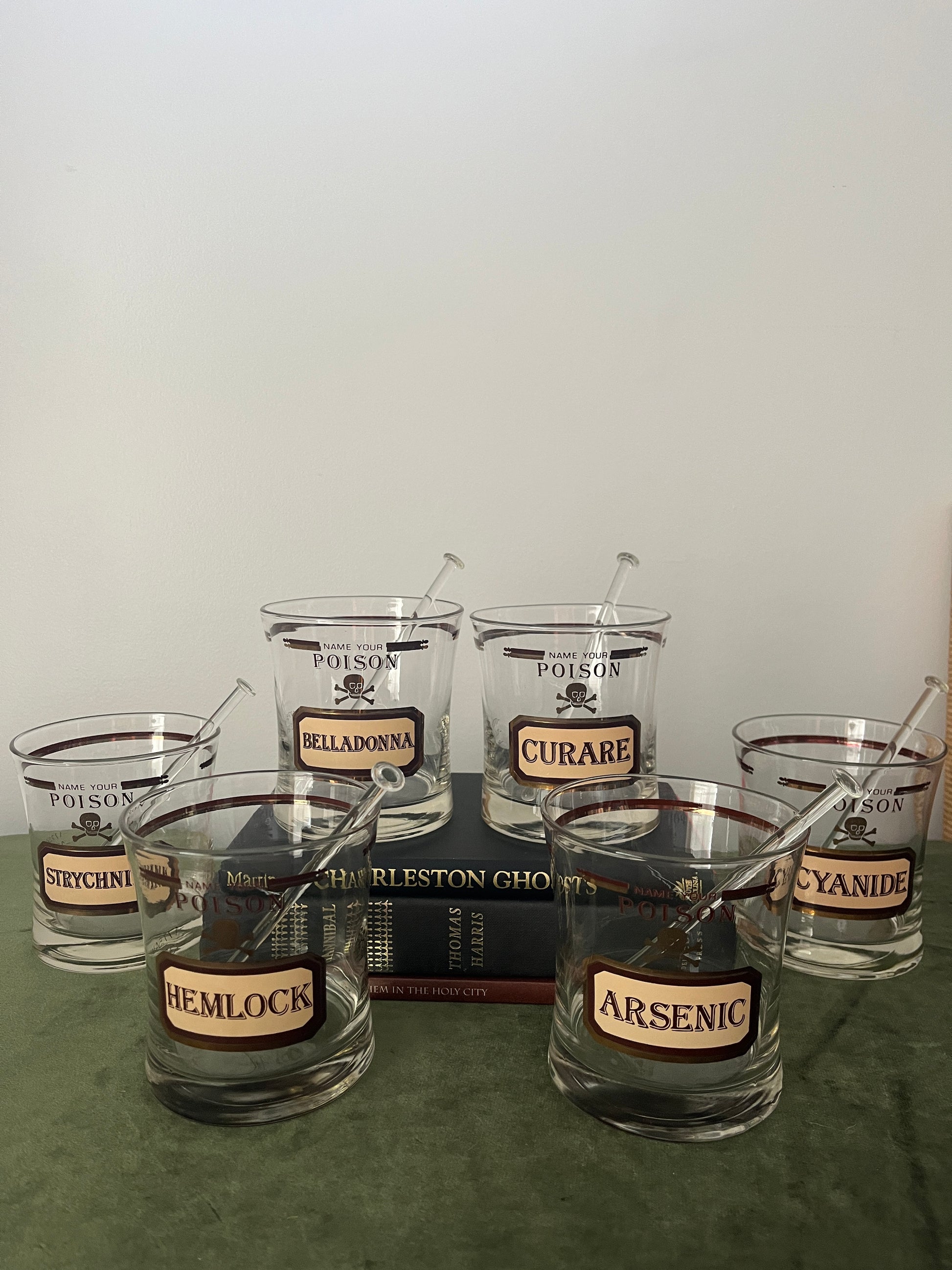 Set of six vintage Cera old fashioned glasses from the 1960s. Each glass names a poison—Cyanide, Strychnine, Hemlock, Belladonna, Arsenic, and Curare—adding a spooky twist to your drinkware. Featuring dark brown, tan, and gold detailing with handy gold measurement markings for mixing the perfect potion. In great vintage condition with some minimal wear to the gold accents, this set also includes matching glass swizzle sticks to stir up your favorite concoctions. Perfect for collectors or anyone who loves a dash of dark humor with their drinks.
