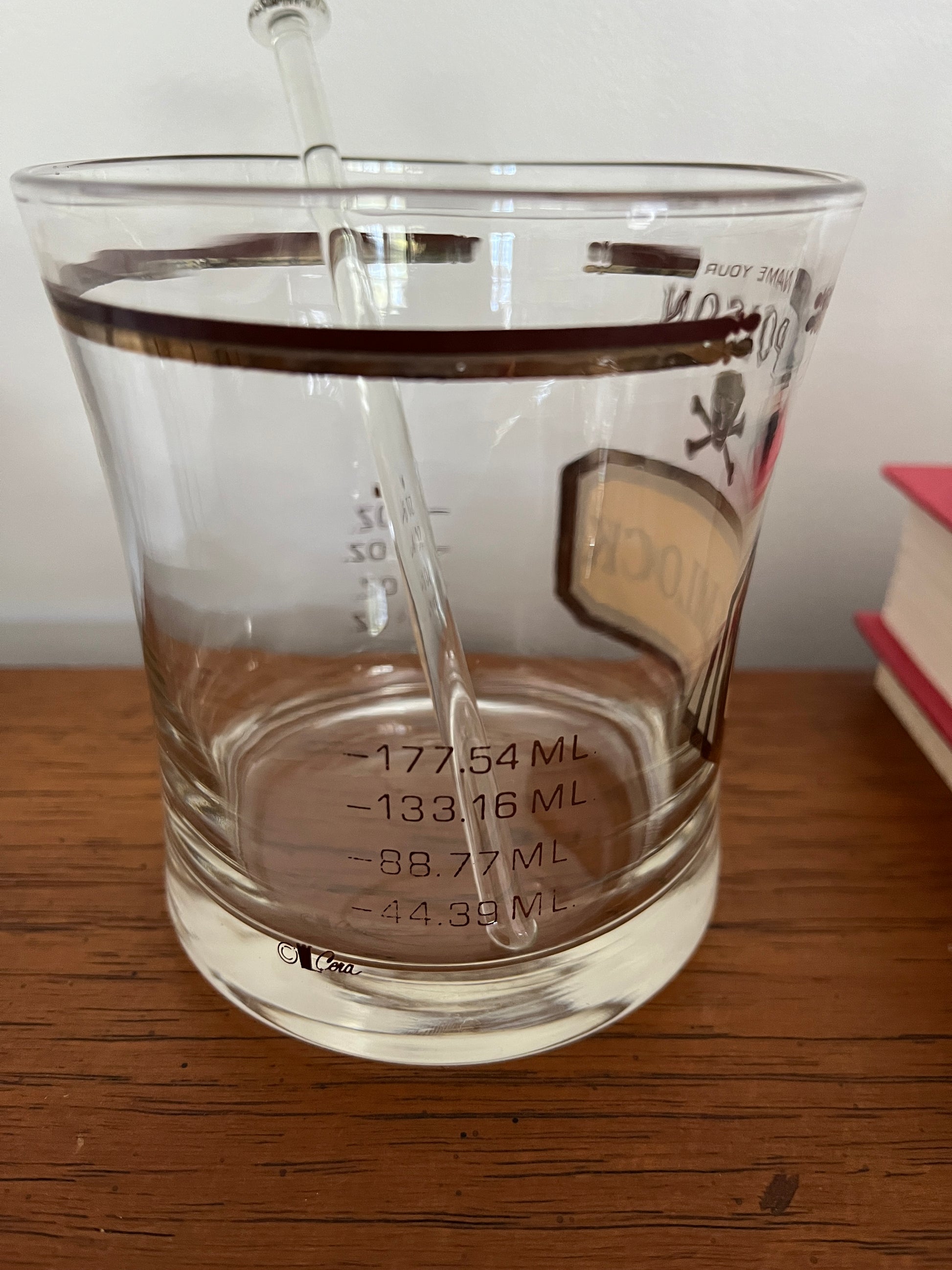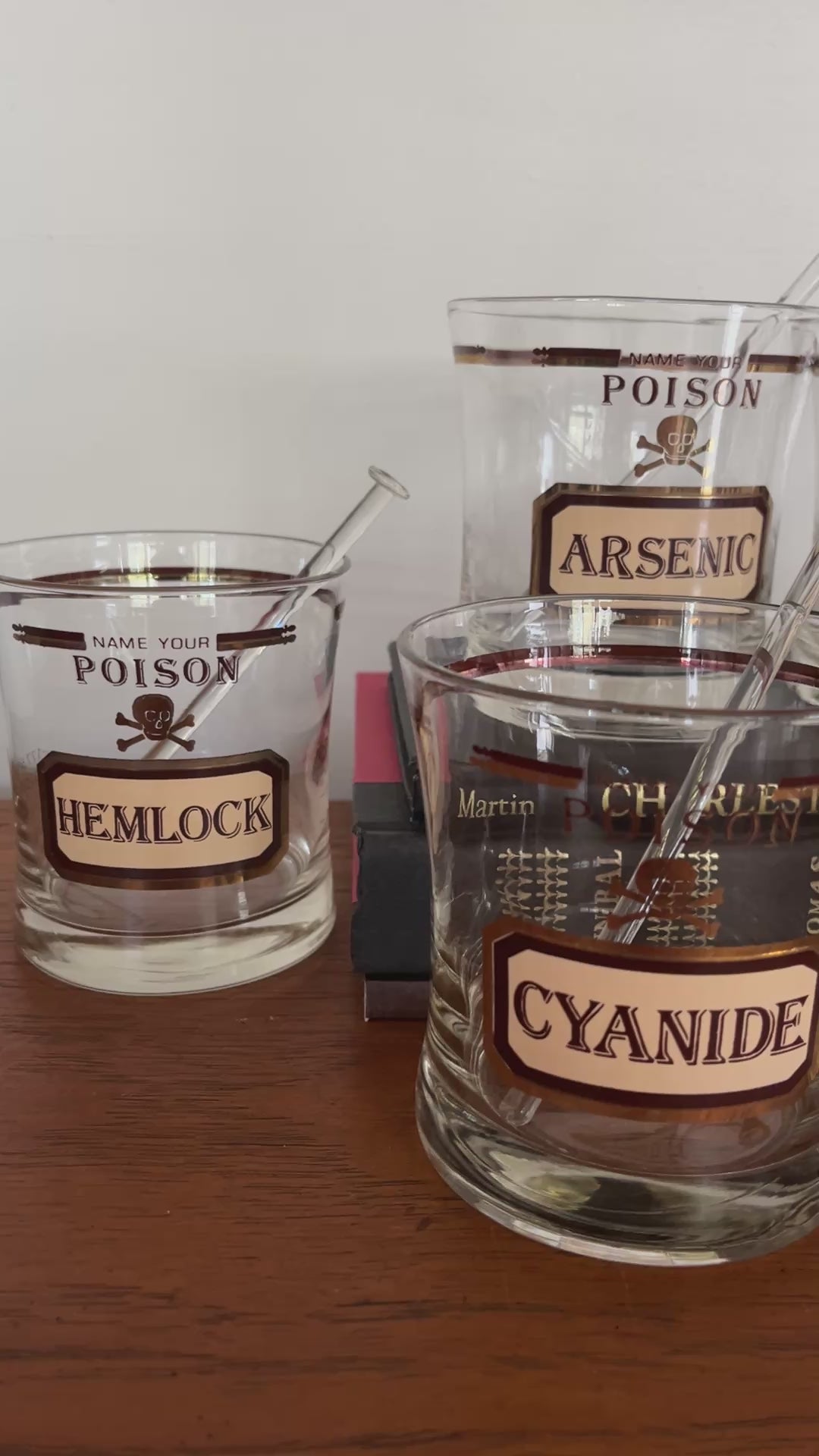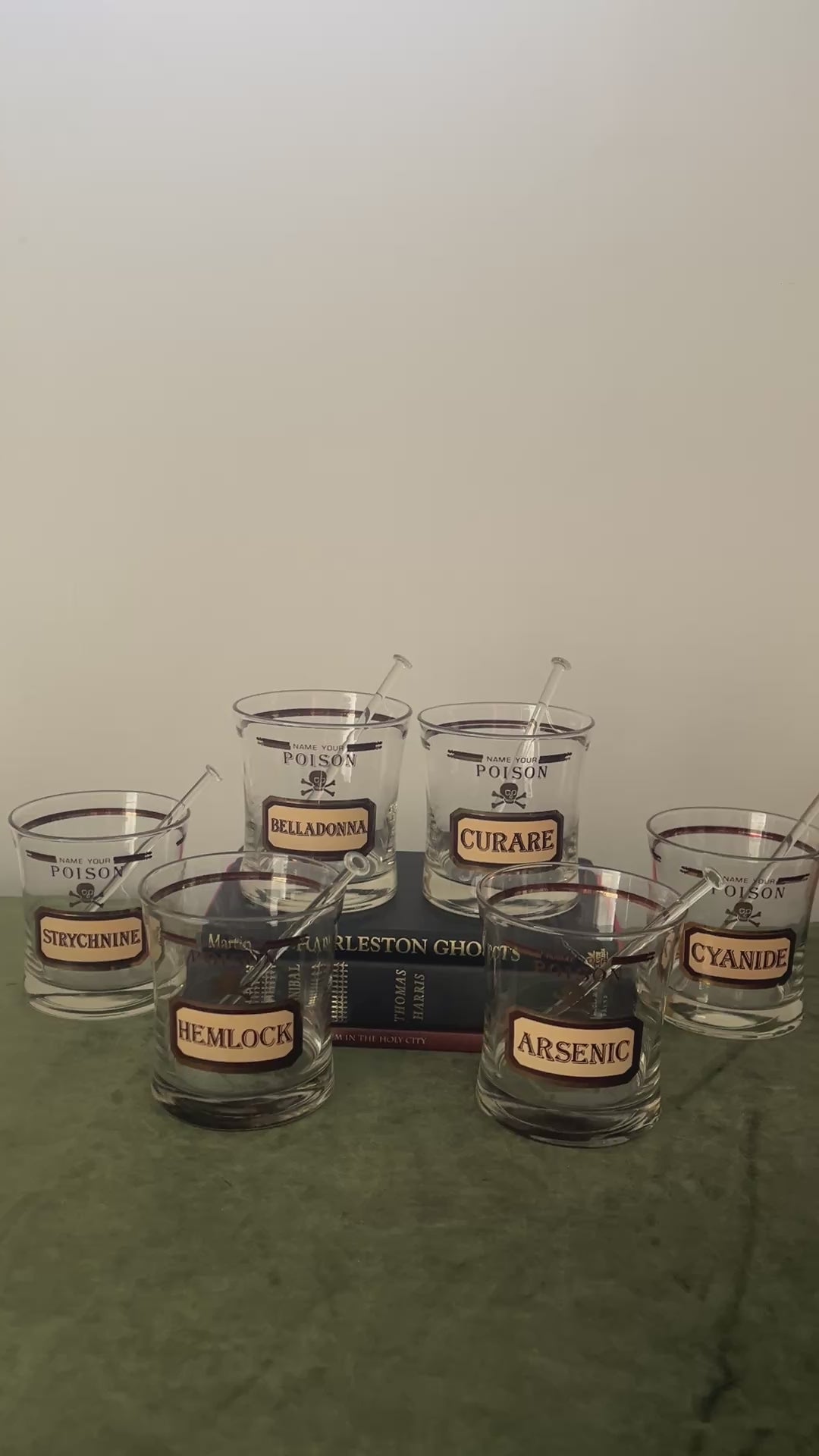 Set of six vintage Cera old fashioned glasses from the 1960s. Each glass names a poison—Cyanide, Strychnine, Hemlock, Belladonna, Arsenic, and Curare—adding a spooky twist to your drinkware. Featuring dark brown, tan, and gold detailing with handy gold measurement markings for mixing the perfect potion. In great vintage condition with some minimal wear to the gold accents, this set also includes matching glass swizzle sticks to stir up your favorite concoctions. Perfect for collectors or anyone who loves a dash of dark humor with their drinks.