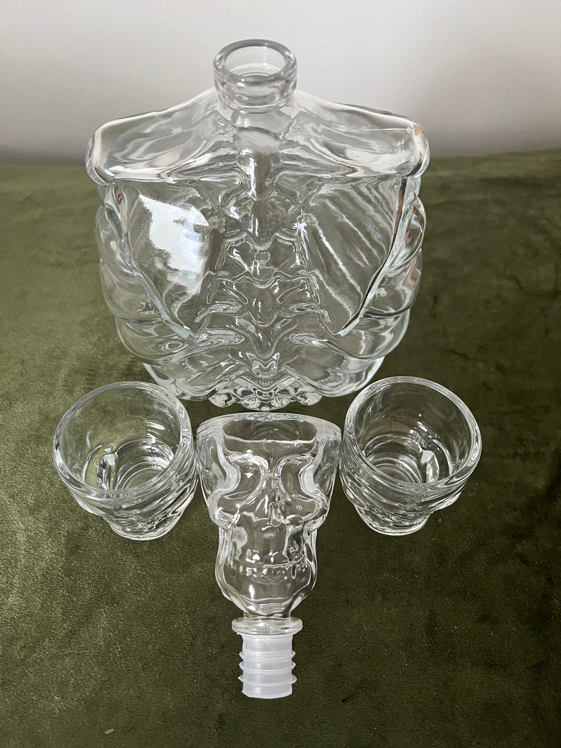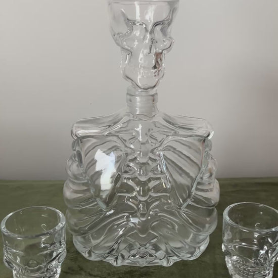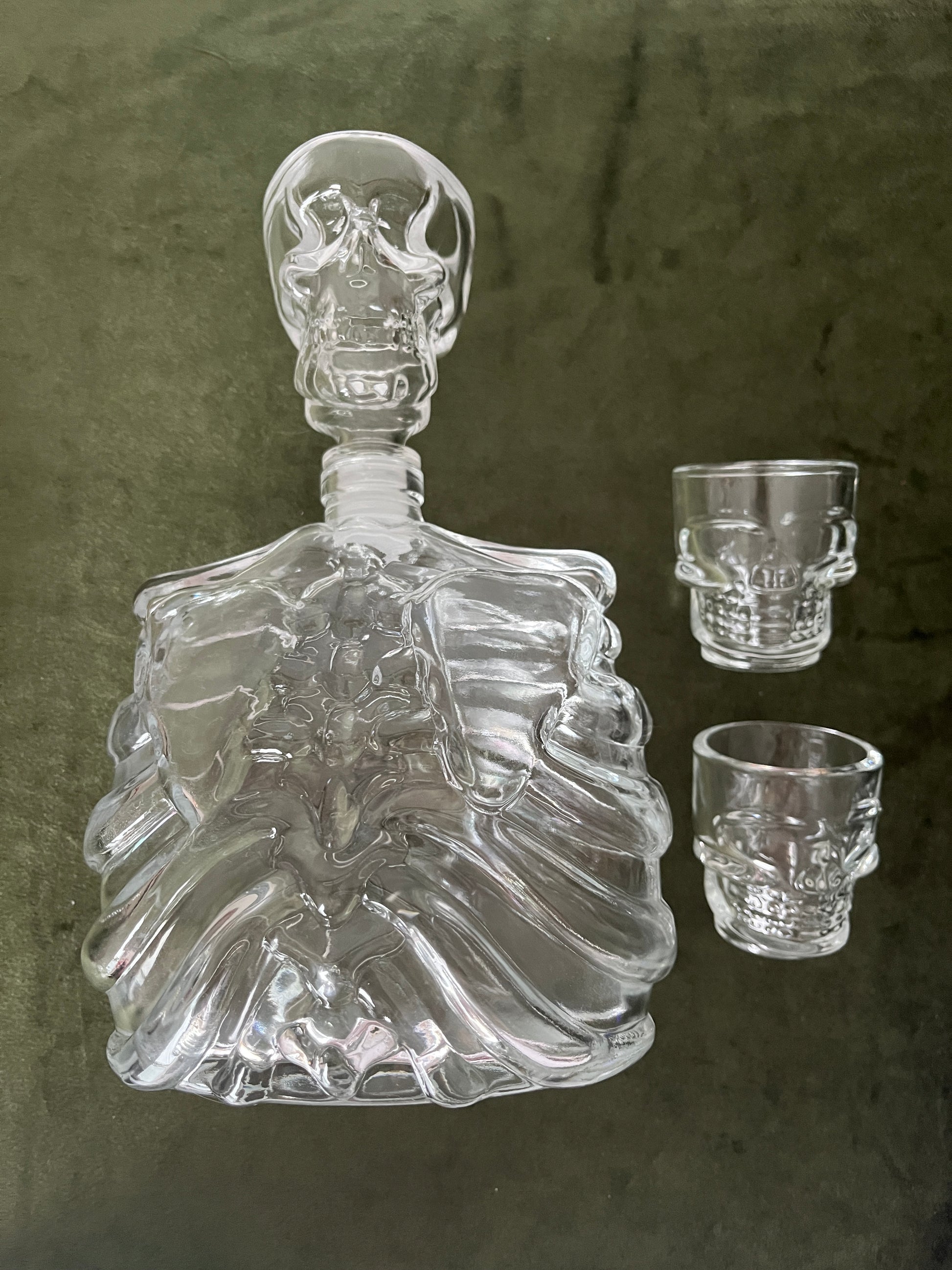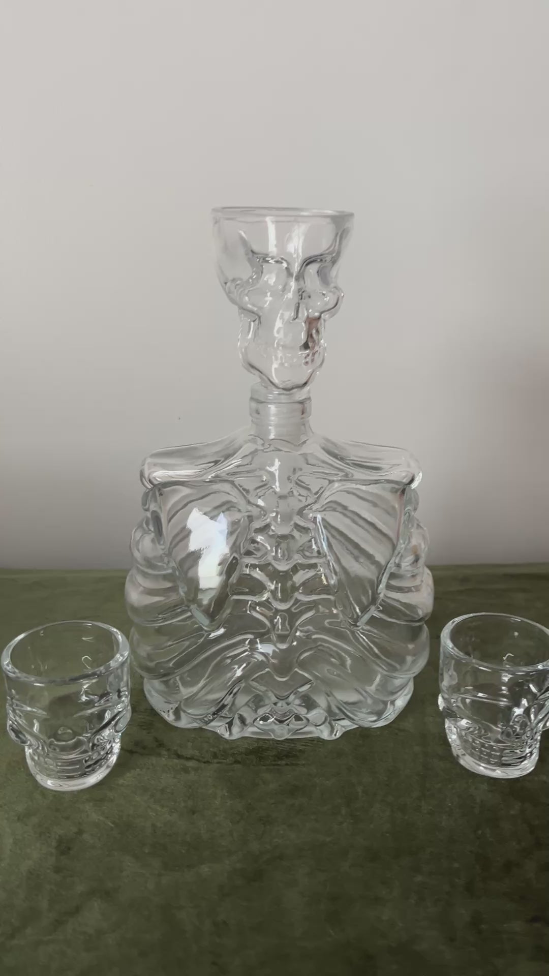 Make a bold statement with this Skull Glass Decanter set, featuring a chilling skull design that demands attention. Made from clear glass, the decanter pairs perfectly with two skull head shot glasses, creating a spooky and daring vibe for your bar. Whether you're hosting a haunted night or just love edgy style, this set brings macabre elegance to every pour and shot. Perfect for those who aren't afraid to stand out and celebrate the dark side of their spirits collection.