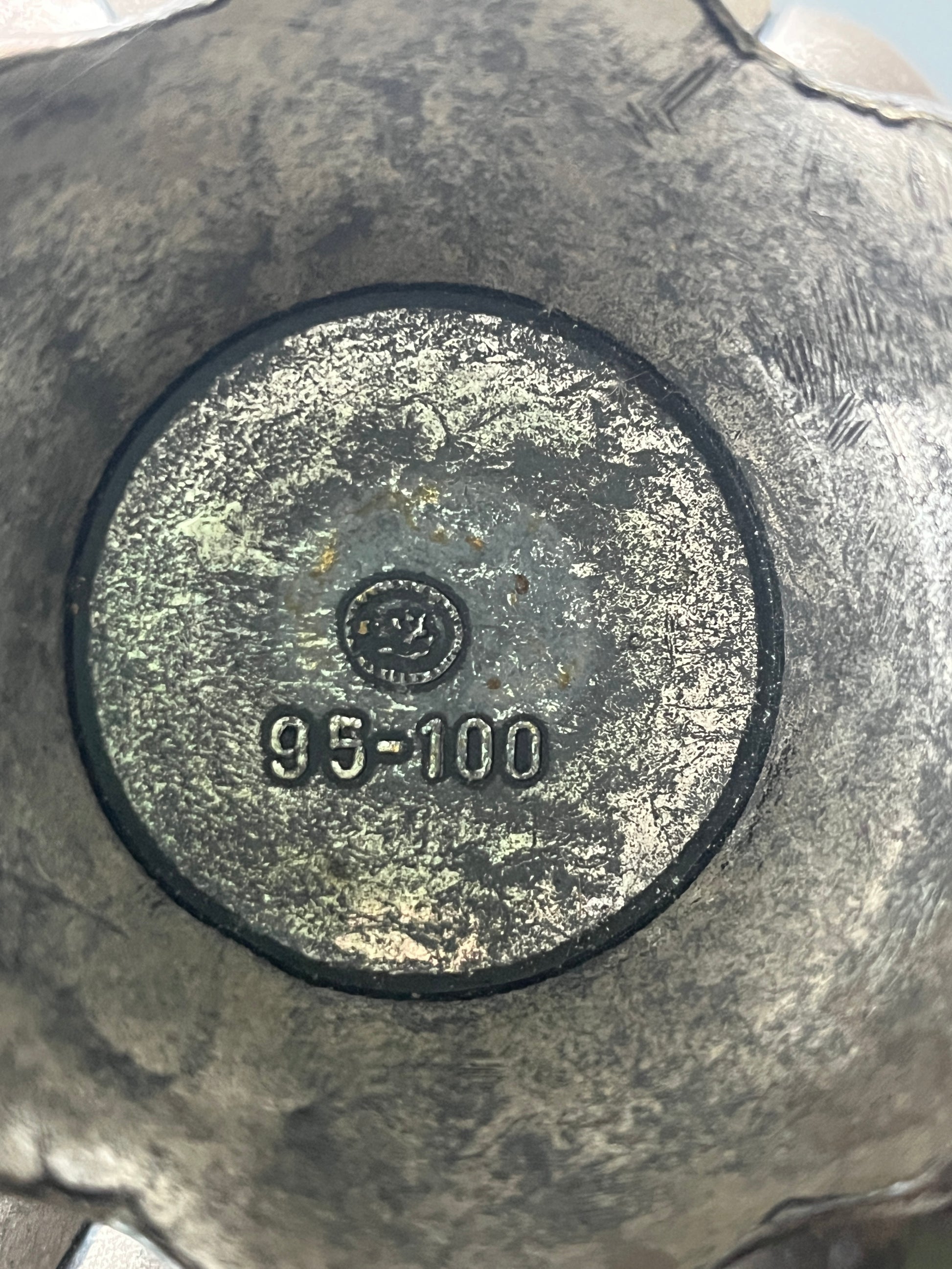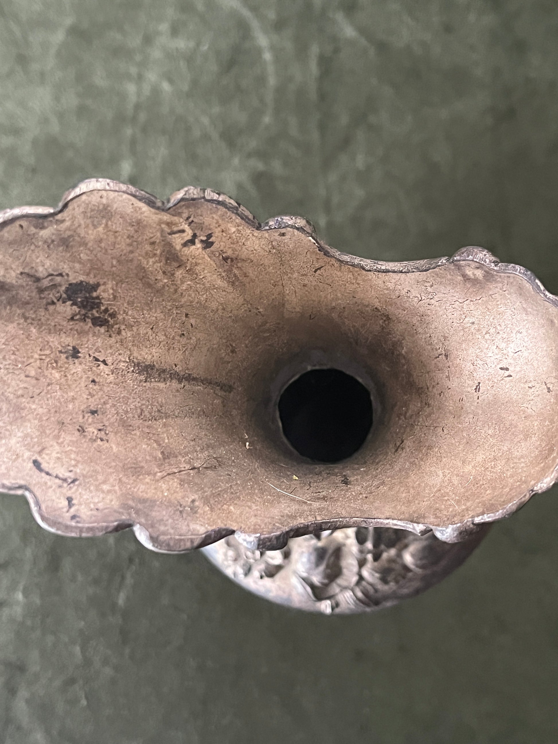 Adorned with a raised floral pattern and hauntingly beautiful tarnish. The bottom half of the vase comes off for easy cleaning and has 95-100 stamped on the underside.
