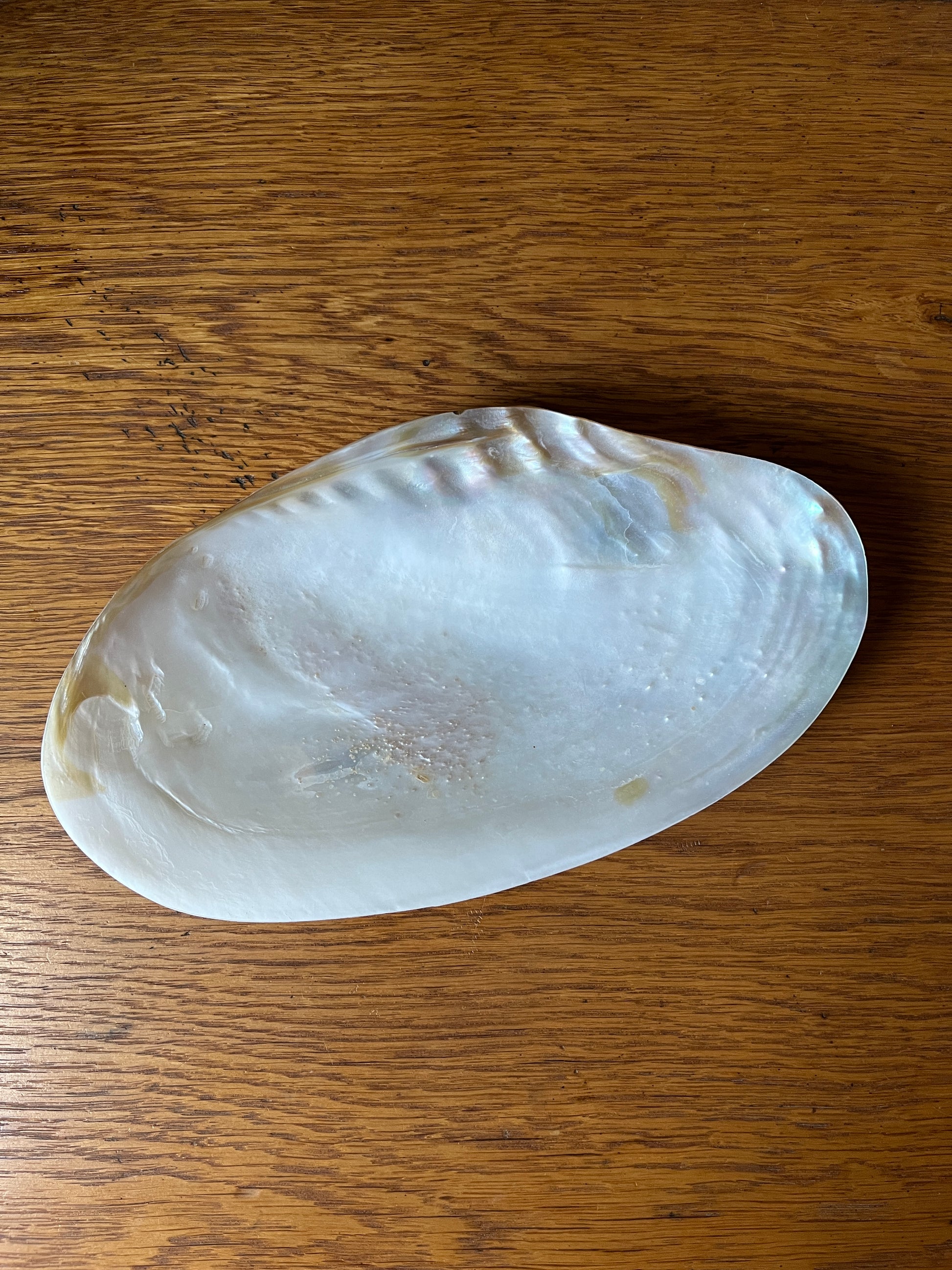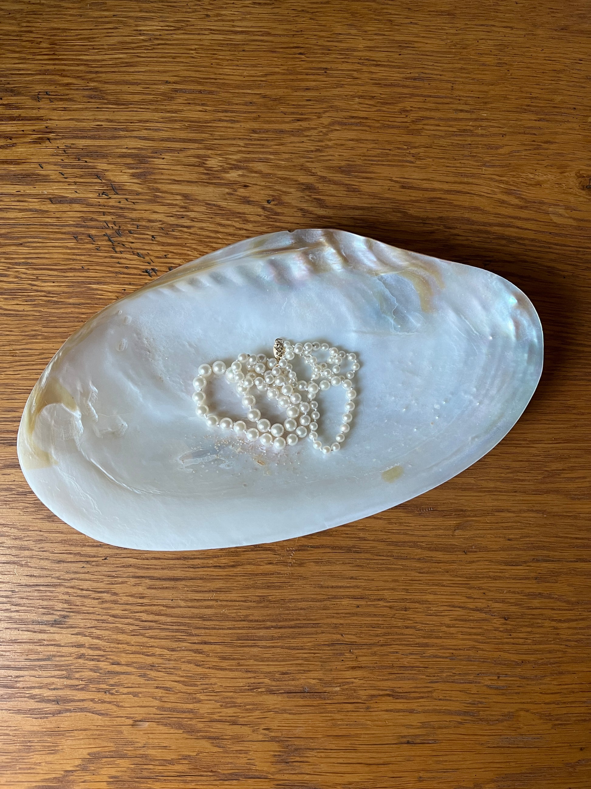 Footed mother of pearl trinket dish. Great for storing your favorite jewels in style.