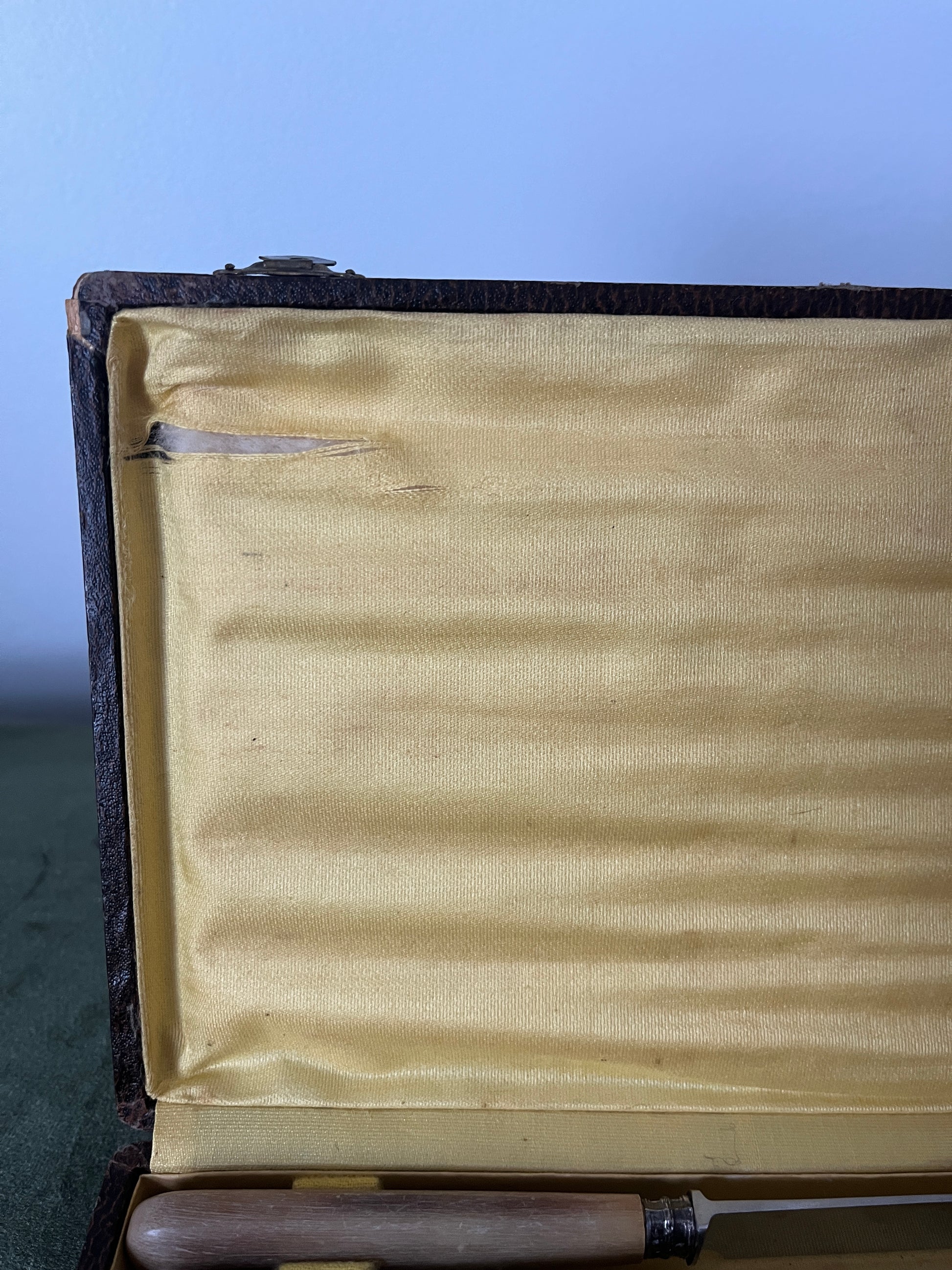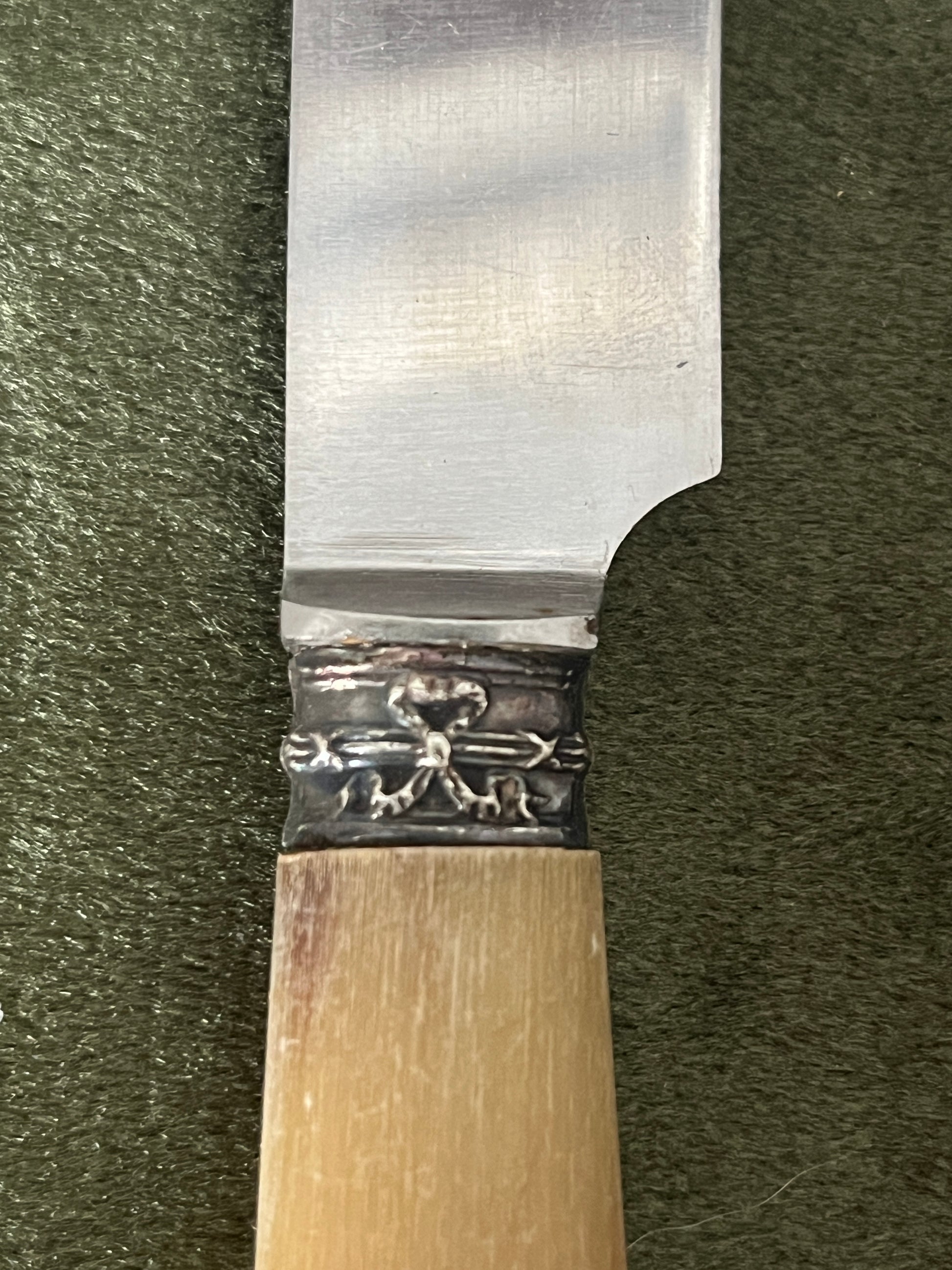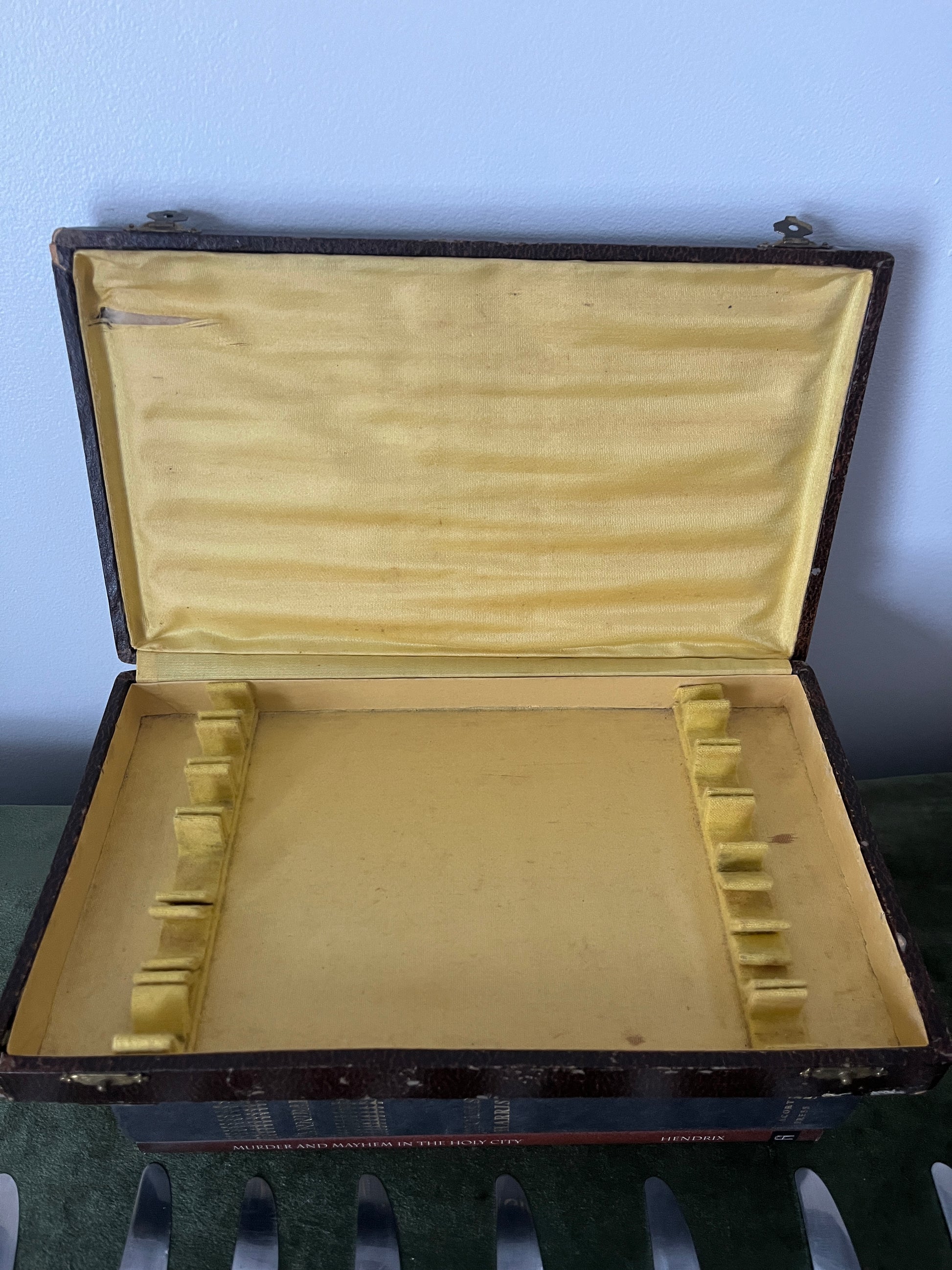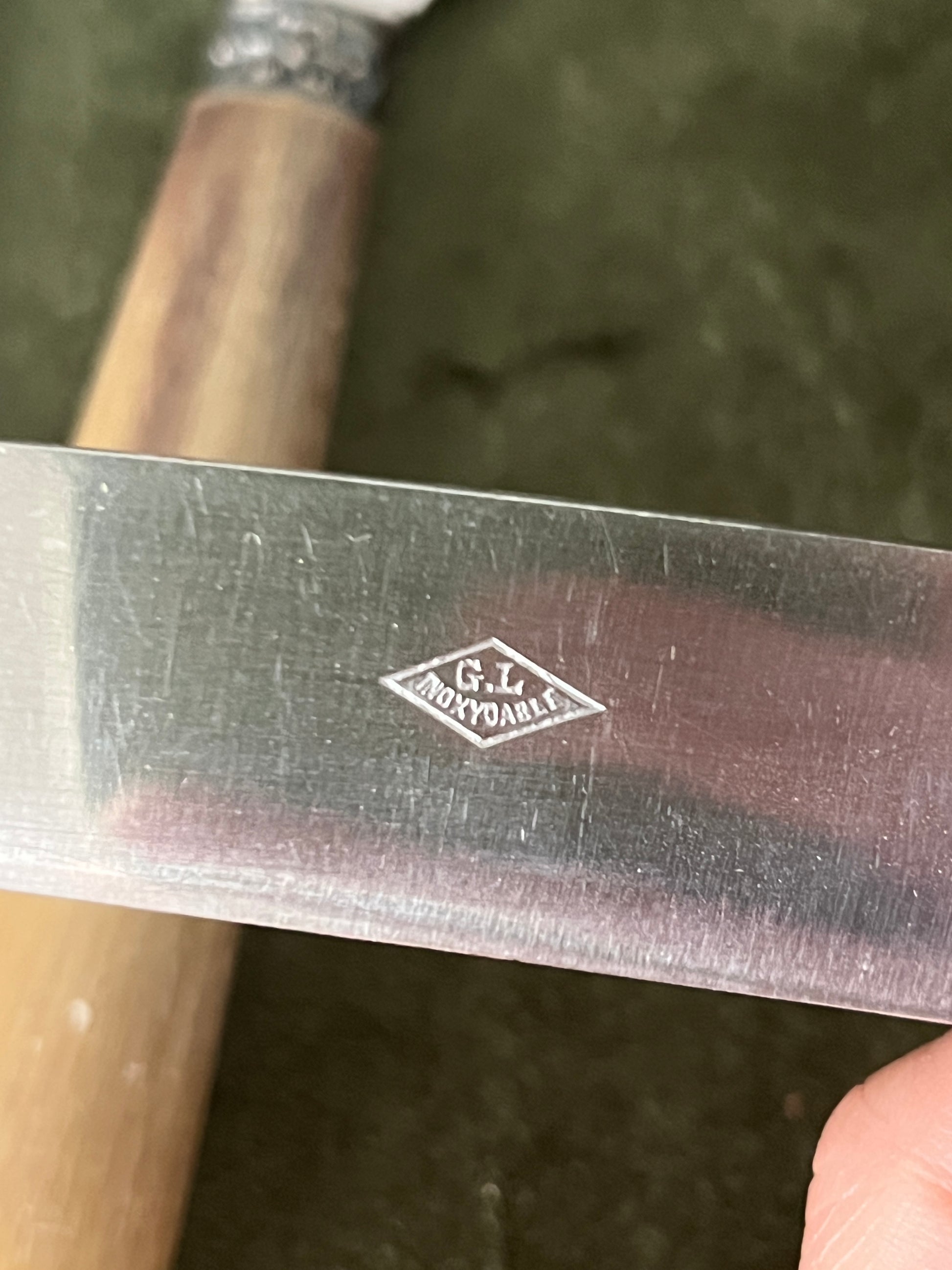 This vintage French knife set features 12 stainless steel (inoxydale) blades paired with elegant horn handles, each uniquely colored due to natural variations in the material. Accented by silver collars, the knives exhibit fine craftsmanship and classic style. The included case shows signs of wear consistent with its age, adding to the set’s authentic vintage character.